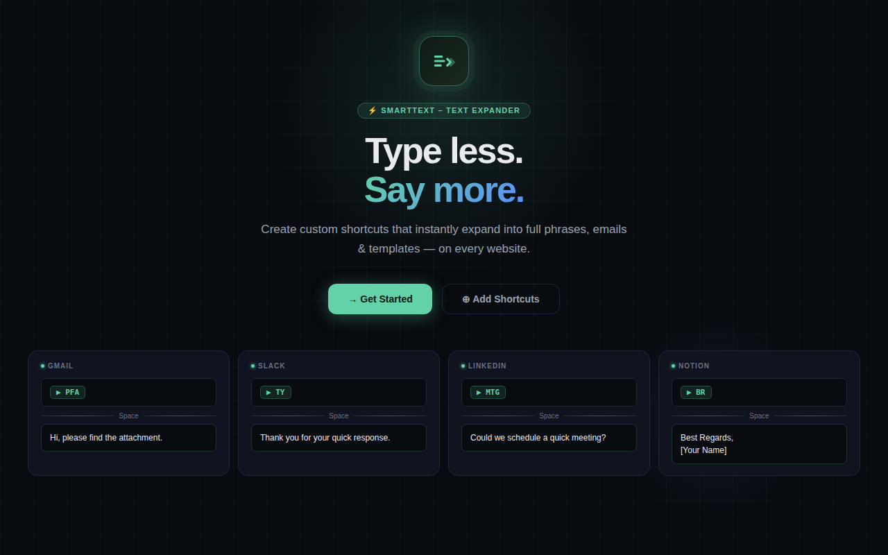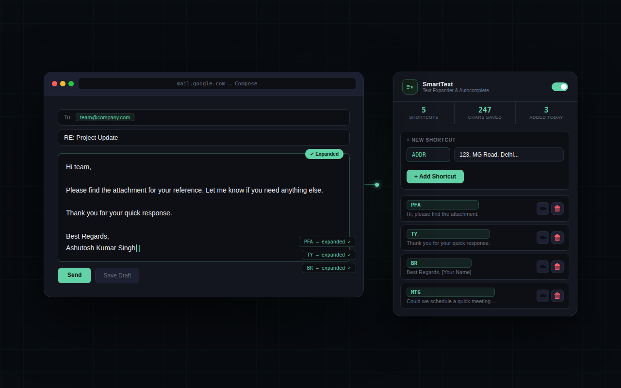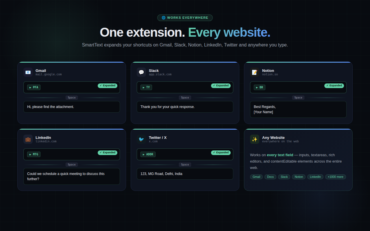 SmartText lets you create shortcuts that instantly expand into full phrases while typing anywhere on the web.